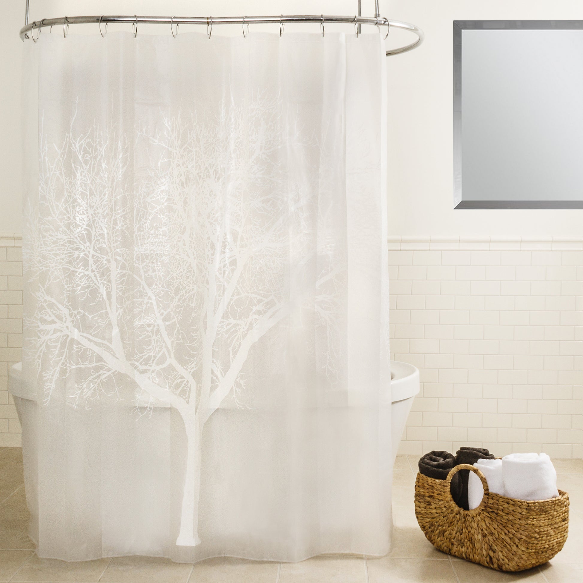 Add a touch of nature to your bathroom with this tree of life PEVA non-toxic shower curtain. This shower curtain measures 70" x 72" Measures 70" x 72" Made of non-toxic PEVA Easily wipes clean Hooks not included