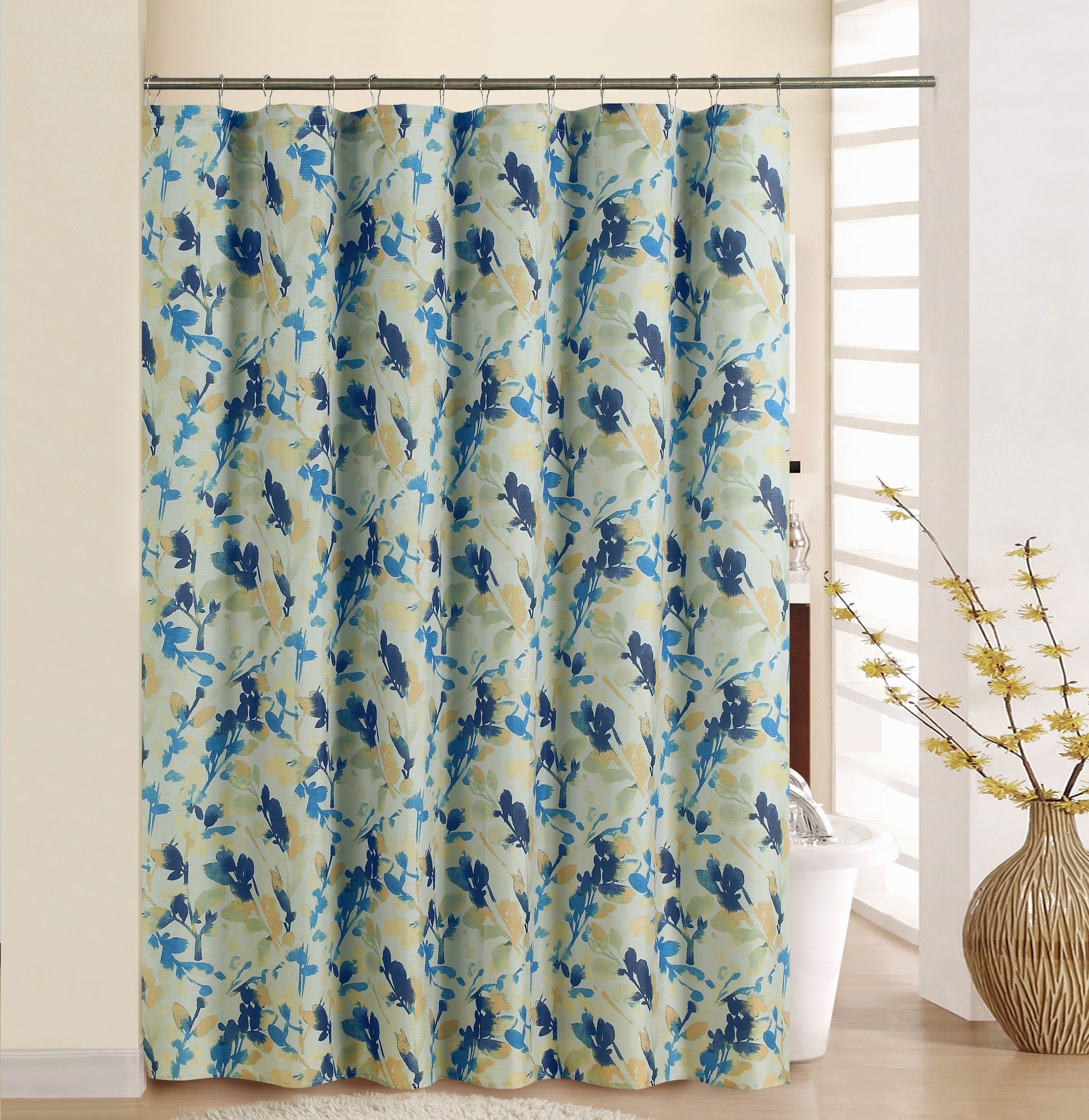 Measures 70" x 72" 100% Polyester Machine washable Includes 12 roller hooks